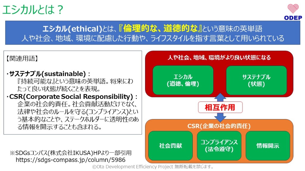 『エシカル(ethical)』とは、『道徳的な、倫理的な』という意味の英語で、最近では人や社会、地域、環境に配慮した行動を指す言葉として用いられています。この言葉はコンプライアンス(法令遵守)だけでなく、人間の道徳、倫理的側面にも踏み込んでいることに着目しなければなりません。