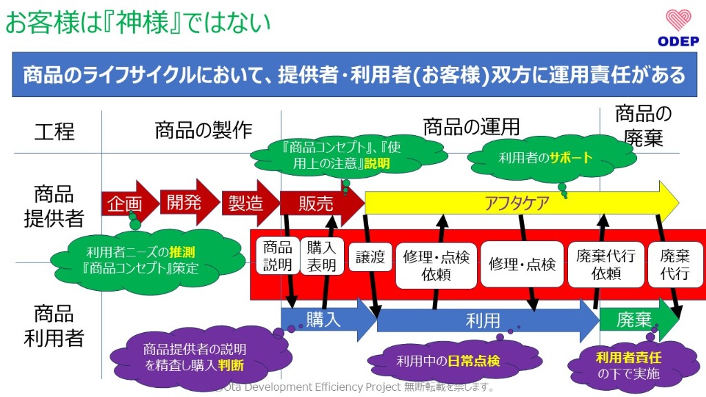 また、利用者が商品購入後、故障・異常等により、利用目的を果たせない場合もあります。その際には点検・修理等のアフタサービスも行う必要がございますし、商品が役目を終え廃棄する際には必要に応じて廃棄代行することもございます。