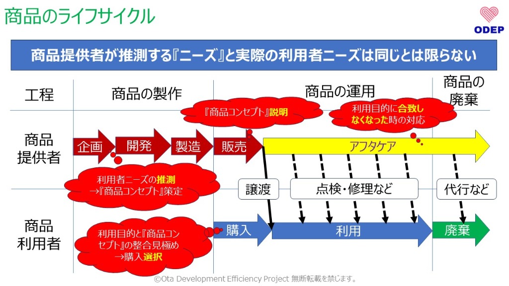 企業は多くの利用者に商品を利用していただくために、統計調査等を通じて市場ニーズを推測します。それをもとに商品コンセプトを策定し、商品コンセプトに準じた商品を開発・生産します。企業の販売者は商品コンセプトを利用者に説明し、利用者は商品コンセプトが利用者の使用目的(本来のニーズ)に合致しているか判断し購入します。